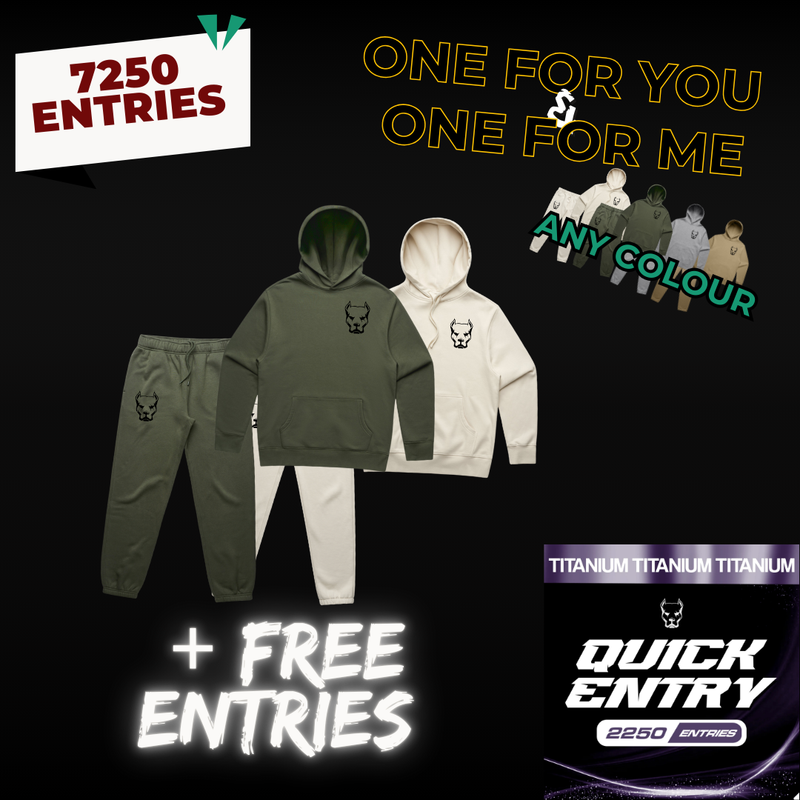 Upgrade your comfort and double your chances to win with this exclusive bundle featuring two full sweat set combos — each including a premium hoodie and matching sweatpants — plus a Titanium Entry Pack worth 7,250 entries toward our next massive giveaway.