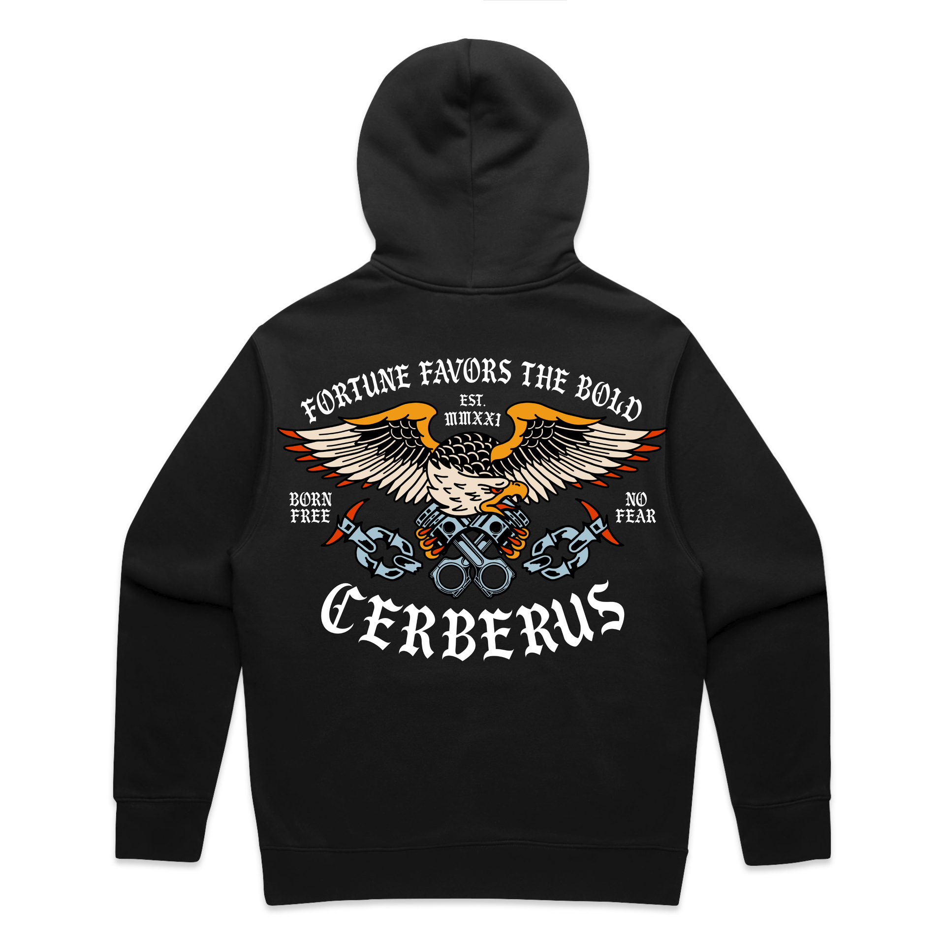 Nothing beats a warm, good-quality hoodie — especially one built to stand out. The Cerberus “Fortune Favors The Bold” Supply Hoodie features a powerful back graphic with a spread-wing eagle, crossed pistons, and bold gothic lettering that represents freedom, strength, and fearless ambition.