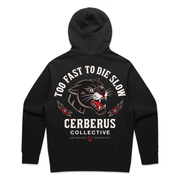 Nothing beats a warm, statement-making hoodie. The Cerberus Collective “Too Fast To Die Slow” Supply Hoodie combines bold attitude with everyday comfort, featuring a striking back graphic with the fierce panther artwork and signature Cerberus branding. Built for cooler days and late-night moves, this is the layer you’ll keep reaching for.