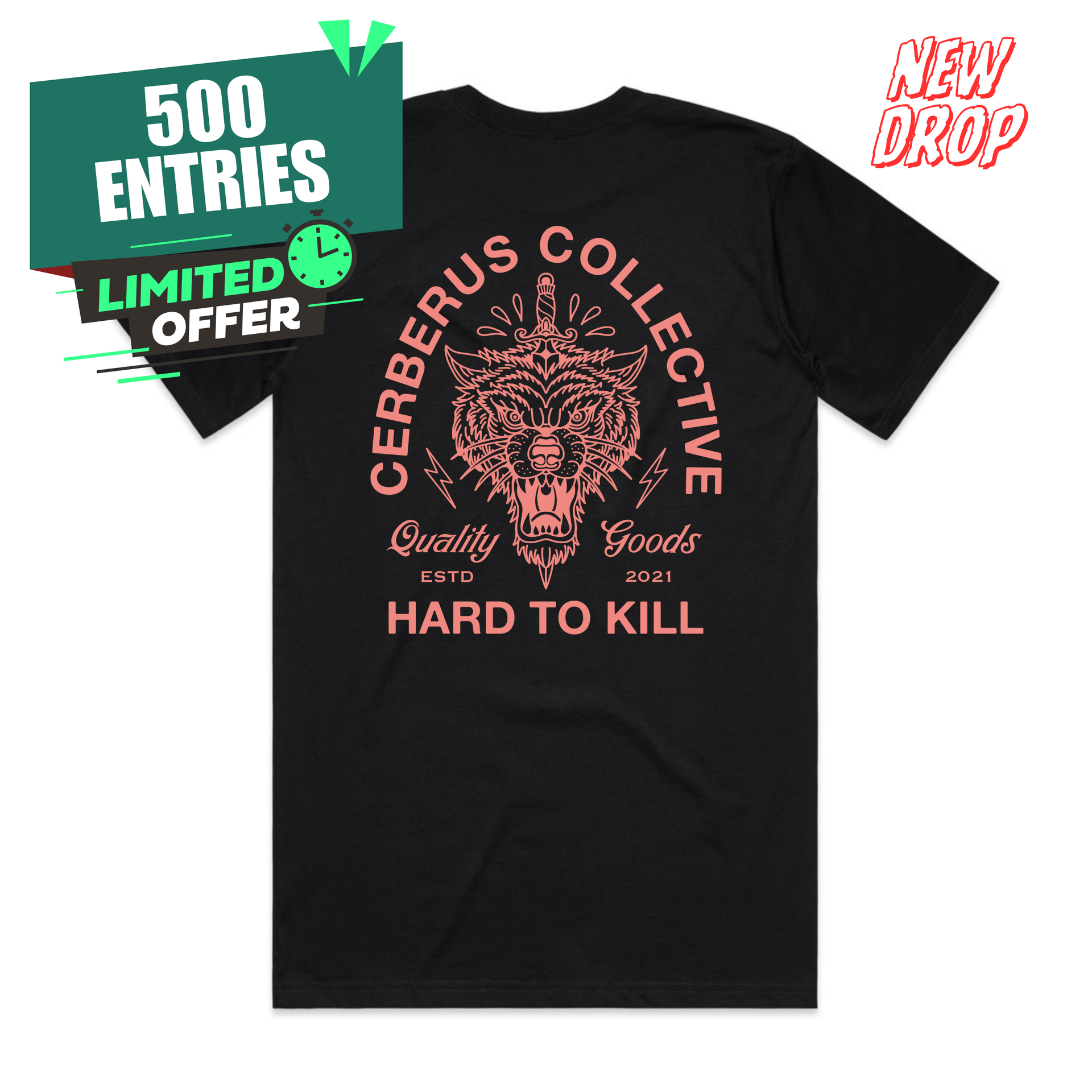 Built for the relentless. The Hard To Kill Tee is a statement piece for anyone who refuses to fold under pressure. Featuring a bold back graphic with our “Cerberus Collective Quality Goods” crest, dagger-wolf artwork, and HARD TO KILL stamped across the bottom—this one’s made to represent toughness, grit, and staying power.